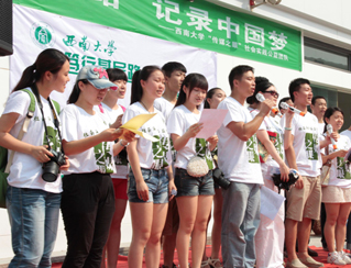 西南大學(xué)“傳媒之眼”社會(huì)實(shí)踐隊(duì)由新聞傳媒學(xué)院團(tuán)委老師李海峰、范曦帶隊(duì),8名研究生、19名本科生組成。團(tuán)隊(duì)圍繞“篤行基層路,記錄中國(guó)夢(mèng)”的主題,自7月3日開(kāi)始,從建設(shè)生態(tài)北碚、“百姓中國(guó)夢(mèng)”主題宣講、“幸福重慶”人文記錄、“山城百姓”社會(huì)調(diào)查四個(gè)方面開(kāi)展活動(dòng)。團(tuán)隊(duì)已經(jīng)在歇馬鎮(zhèn)碚青路中心廣場(chǎng)舉行了文藝匯演,并給群眾帶來(lái)了各種各樣的避暑藥品;到歇馬污水處理廠,了解當(dāng)?shù)厣a(chǎn)生活污水的處理;到重慶歇馬機(jī)械曲軸有限公司,宣傳“節(jié)能生產(chǎn)”理念,在員工中開(kāi)展環(huán)保培訓(xùn),強(qiáng)調(diào)可持續(xù)生產(chǎn)和發(fā)展。