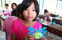 活動現(xiàn)場,孩子們盡情發(fā)揮自己的想象,用有限的廢紙、易拉罐等廢棄材料創(chuàng)造出了各種富有特色的手工藝作品。許多學(xué)生的創(chuàng)意作品超出了隊員們的想象,隊員們?nèi)滩蛔∨氖纸泻。雷州市烏石?zhèn)三教小學(xué)六年級學(xué)生用日常可見的易拉罐瓶設(shè)計出簡易的小垃圾桶。將平凡的垃圾桶擬人化,還在設(shè)計出來的垃圾桶上寫著“保護(hù)環(huán)境、愛護(hù)家園”等標(biāo)語。二年級學(xué)生設(shè)計出的綠色太陽花,說那是一朵綠花,那是一個希望。