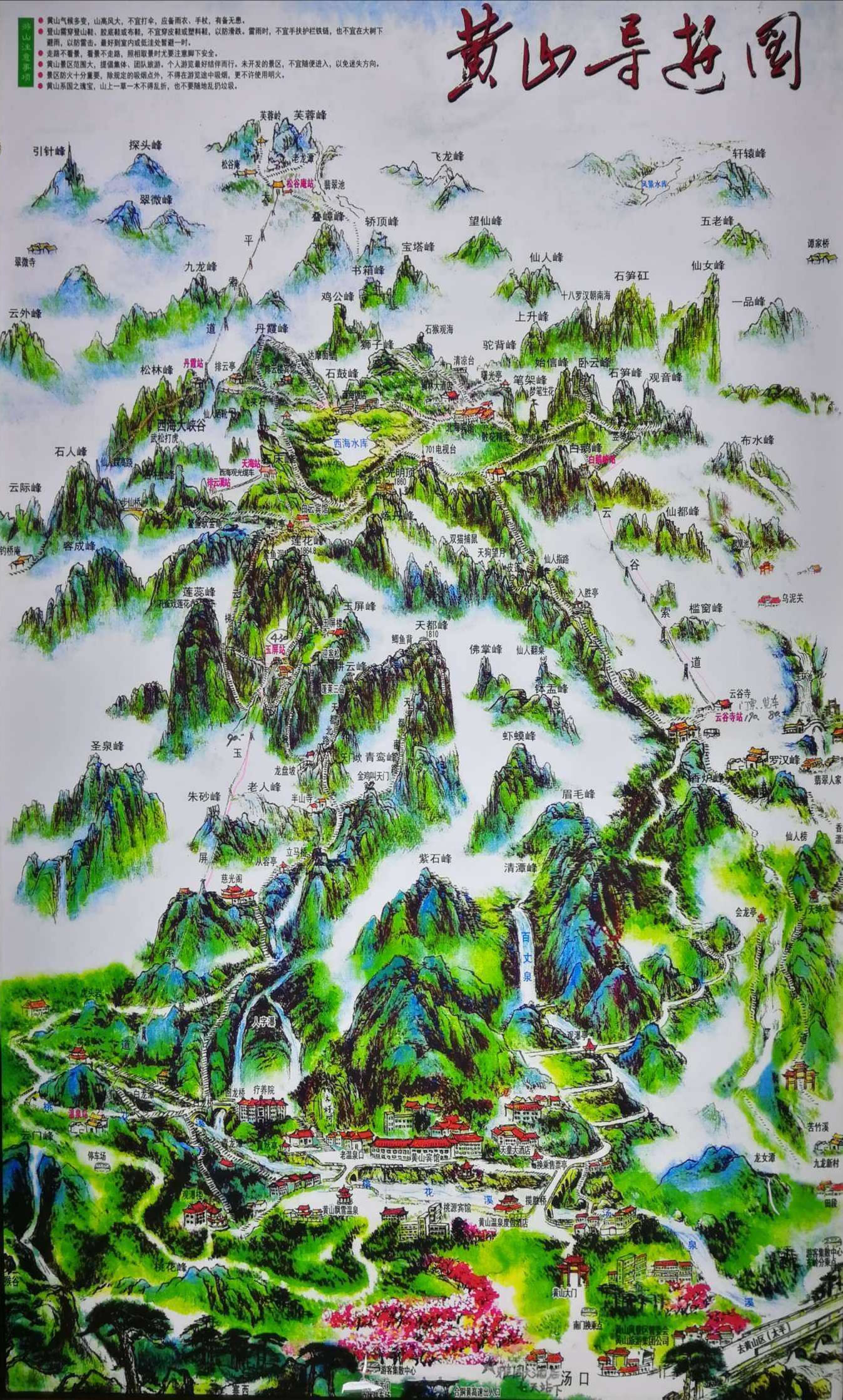 始信峰,從黑虎松進入依次有黑虎松,連理松,龍爪松,在觀景臺前方有石筍峰,石筍峰遠(yuǎn)眺有觀音漂海。觀景臺左有臥云峰,臥云峰上有探海松,臥龍松,觀景臺右行10米有豎琴松(轅門松),觀景臺左行去始信峰頂邊有接引松,始信峰頂有聚音松。