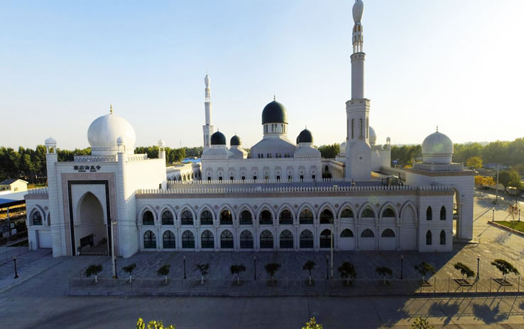 竇店清真寺 2011年8月9日,竇店新建清真寺破土動工,2017年7月1日竣工,并于開齋節(jié)當(dāng)天正式啟用。 竇店清真寺占地14958平方米,建筑面積12142平方米,能同時容納1500人禮拜。清真寺呈回字形布局,設(shè)有大殿、副殿、講堂、辦公室、接待室、會議室、展室、埋體房、洗浴室、餐廳等,大殿位于正中央,形成“眾星捧月”的建筑風(fēng)格。