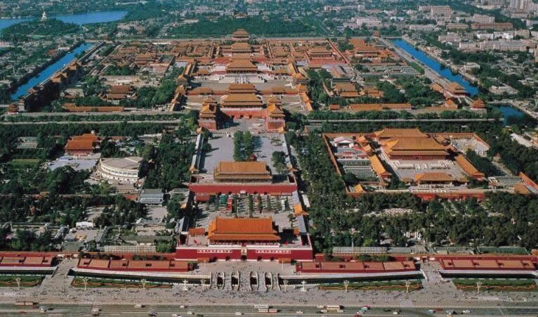 故宮位于北京城中心,布局依據(jù)《周禮·考工記》中所載:“左祖、右社、面朝、后市”的原則,建筑在北京城南北長八公里的中軸線上,南北取直,左右對(duì)稱。如今故宮左前面的勞動(dòng)人民文化宮,明清是皇帝祭祀祖宗的太廟;右前面的中山公園是皇帝祭祀土神和谷神的社稷壇;前面有朝臣辦事的處所;后面有人們進(jìn)行交易的市場。北京故宮的北面是萬歲山,南面是金水河,恰好符合古人“負(fù)陰抱陽,沖氣為和”的建宮原則,萬歲山是專門為營造皇城風(fēng)水而筑城的一座人工山,完成于明初,位于元代寢宮延春閣舊址,用開挖護(hù)城河和南湖的淤泥堆積而成。此山的堆筑,一方面滿足了皇城要“負(fù)陰”的原則,另一方面又鎮(zhèn)住了前朝的風(fēng)水,故萬歲山又有“鎮(zhèn)山”之稱。北京四九城的布局是二龍出水護(hù)著紫禁城。依照中國古代星象學(xué)說,紫微星(即北極星)位于中天,乃天帝所居,天人對(duì)應(yīng),是以皇帝的居所又稱紫禁城。