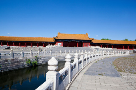 太和門前有面積約26000平方米的廣場,內(nèi)金水河自西向東蜿蜒流過。河上橫架五座石橋,習(xí)稱內(nèi)金水橋。廣場兩側(cè)是排列整齊的廊廡,習(xí)稱東、西朝房,并有協(xié)和門(明代稱會(huì)極門)和熙和門(明代稱歸極門)東西對(duì)峙。東側(cè)廊廡在明代用作實(shí)錄館、玉牒館和起居注館,清代改作稽察欽奉上諭事件處和內(nèi)誥敕房。西側(cè)廊廡在明代為編修《大明會(huì)典》的會(huì)典館,清代改為繙書房和起居注館。