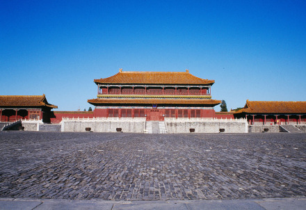 午門是故宮的正門。俗稱五鳳樓。東西北三面以12米高的城臺(tái)相連,環(huán)抱一個(gè)方形廣場。有1組建筑。正中有重樓,是9間面寬的大殿,重檐廡殿頂,在左右伸出兩闕城墻上,建有聯(lián)檐通脊的樓閣四座,明廊相連,兩翼各有13間的殿屋向南伸出,四隅各有高大的角亭,輔翼著正殿。這組城上的建筑,是故宮宮殿群中第一高峰。午門是皇帝下詔書、下令出征的地方。它當(dāng)中的正門平時(shí)只有皇帝才可以出入;皇帝大婚時(shí)皇后進(jìn)一次;殿試考中狀元、榜眼、探花的三人可以從此門走出一次。文武大臣進(jìn)出東側(cè)門,宗室王公出入西側(cè)門。