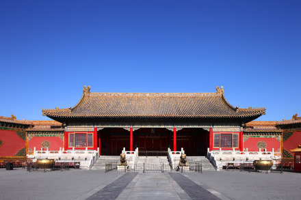 交泰殿為內(nèi)廷后三宮之一,位于乾清宮和坤寧宮之間,約為明嘉靖年間建。交泰殿平面為方形,深、廣各3間。明間設(shè)寶座,上懸康熙帝御書“無為”匾,寶座后有板屏一面,上書乾隆帝御制《交泰殿銘》。交泰殿為皇后千秋節(jié)受慶賀禮的地方。清代于此殿貯清二十五寶璽。每年正月,由欽天監(jiān)選擇吉日吉時(shí),設(shè)案開封陳寶,皇帝來此拈香行禮。清世祖所立“內(nèi)宮不許干預(yù)政事”的鐵牌曾立于此殿;实鄞蠡闀r(shí),皇后的冊、寶安設(shè)殿內(nèi)左右案上。每年春季祀先蠶,皇后先一日在此查閱采桑的用具。