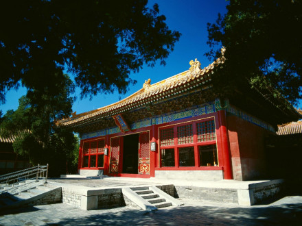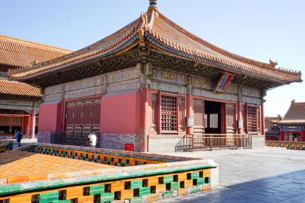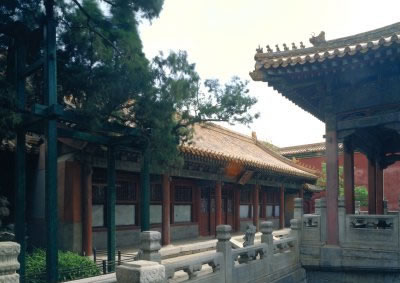 永和宮,內(nèi)廷東六宮之一,位于承乾宮之東、景陽宮之南。明代為妃嬪所居,清代為后妃所居。清康熙帝孝恭仁皇后久居此宮。其后,道光帝靜貴妃,咸豐帝麗貴人等先后在此居住。宮為二進(jìn)院,正門南向,名永和門,前院正殿即永和宮,面闊5間。明間開門,次、梢間皆為檻墻,上安支窗。正間室內(nèi)懸乾隆御題“儀昭淑慎”匾,吊白樘箅子頂棚,方磚墁地。東西有配殿各3間,明間開門,黃琉璃瓦硬山式頂,檐下飾旋子彩畫。東西配殿的北側(cè)皆為耳房,各3間。