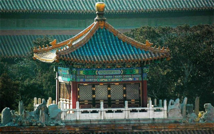 御景亭位于御花園內(nèi)東側(cè)的假山頂上。原是明代觀花殿的舊址,萬歷間改堆假山。山的東西山石間各有登道,拾級(jí)而上可達(dá)山頂御景亭。亭子平面方形,四柱,一斗二升交蔴葉斗栱,攢尖頂,上覆翠綠琉璃瓦,黃色琉璃瓦剪邊,鎏金寶頂,四面設(shè)隔扇門。四周圍繞著漢白玉石欄板。亭內(nèi)天花藻井,面南設(shè)寶座。御景亭是皇帝、皇后在農(nóng)歷九月初九重陽節(jié)登高的地方。自亭上可俯瞰宮苑,遠(yuǎn)眺故宮、景山、西苑。