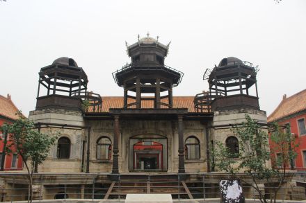 延禧宮為內(nèi)廷東六宮之一,建于明永樂十八年(1420年),初名長壽宮。殿前有東西配殿各3間。后院正殿5間,亦有東西配殿各3間,均為黃琉璃瓦硬山頂。宣統(tǒng)元年(1909年)在延禧宮原址興工修建一座3層西洋式建筑——水殿。水殿四周浚池,引玉泉山水環(huán)繞。主樓每層9間,底層四面當(dāng)中各開一門,四周環(huán)以圍廊。隆裕太后題匾額曰“靈沼軒”,俗稱“水晶宮”。1917年張勛復(fù)辟時(shí),延禧宮北部被直系部隊(duì)飛機(jī)投彈炸毀。