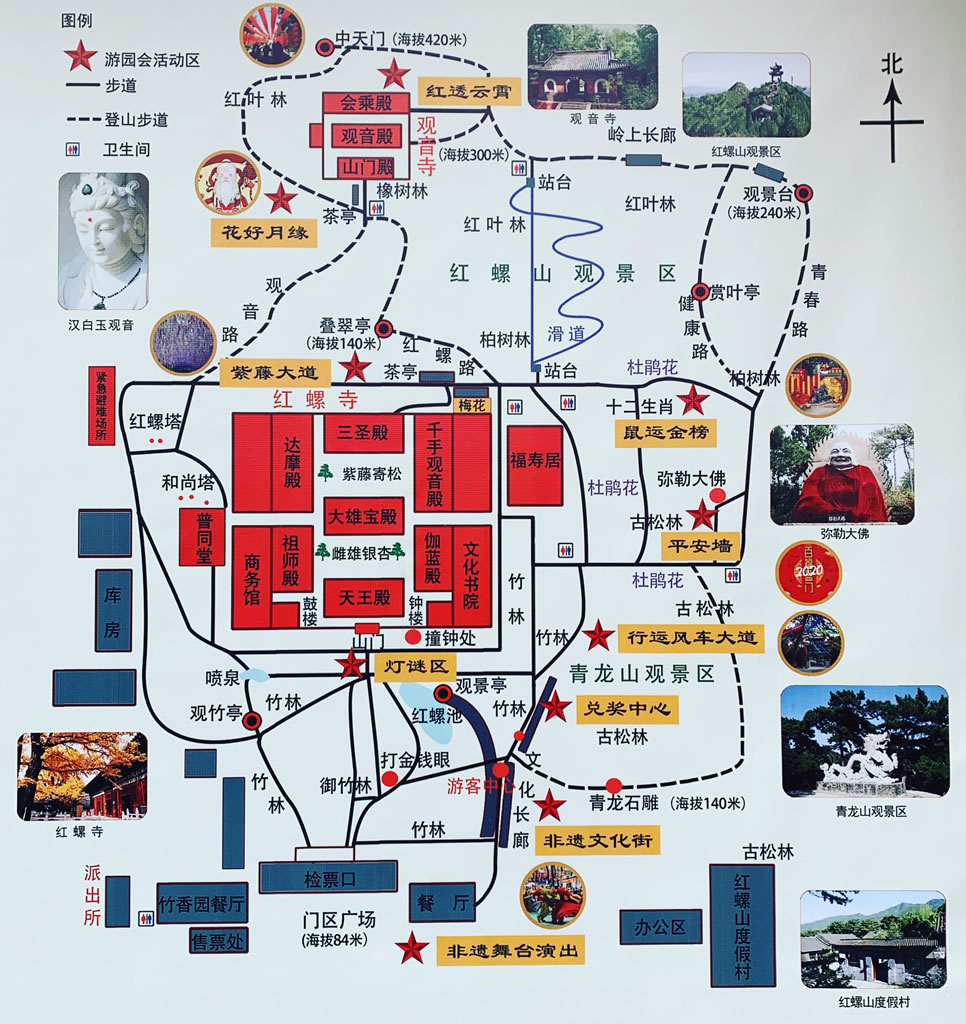 旅游區(qū)環(huán)境幽雅,古木參天,經(jīng)年常青,四季花香,人文景觀與自然景觀競秀。紫藤寄松、御竹林、雌雄銀杏號稱三絕景;寺西之珍珠泉,碧透似鏡,沸泡如珠,有神泉之稱;寺南之紅螺湖,水波蕩漾,溢彩流光,是一個劃船、游泳、垂釣的好去處。景區(qū)經(jīng)多年開發(fā)建設,逐步形成了“吃、住、行、游、購、娛”于一體的、綜合配套設施完備的旅游度假風景區(qū)。 |