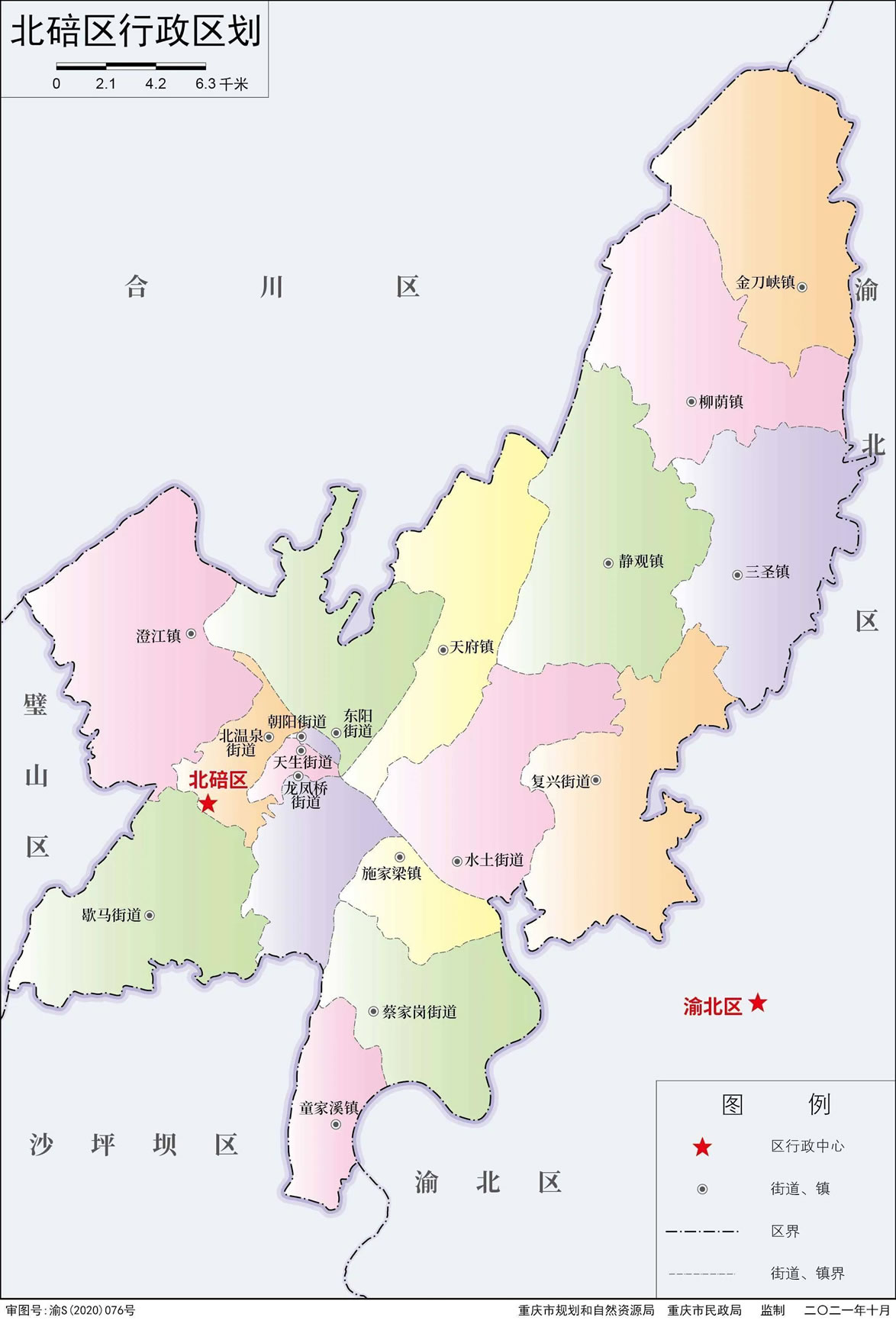 街道:天生街道、朝陽街道、北溫泉街道、龍鳳橋街道、東陽街道、蔡家崗街道、歇馬街道、水土街道、復(fù)興街道