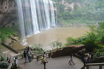 水簾洞位于瀑布下方,由整塊的巨巖組成。巨巖由砂巖青石構(gòu)成,面積有上萬平方米。水簾洞內(nèi)能以360度的全景視角觀賞到大瀑布“飛流直下三千尺,疑是銀河落九天”的恢宏氣勢,體驗與瀑布親密接觸的清爽,領(lǐng)略春雨瀟瀟、秋雨綿綿、夏雨磅礴的四季風(fēng)雨情致,有奇妙的季節(jié)穿越之感。