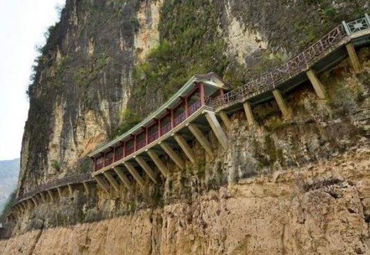 大寧河古棧道遺跡,上下孔眼交錯(cuò)成倒“品”字,上排兩孔插木樁,鋪木板,下孔插木柱斜撐木板,構(gòu)成三角形支撐架,從而修筑成供人畜行走的“棧道”。 古棧道以寧河為主干,從龍門(mén)峽口,經(jīng)巫溪縣延伸到陜西的鎮(zhèn)平縣、湖北溪縣、重慶城口縣一帶。寧河棧道總長(zhǎng)約400多千米,其長(zhǎng)度超過(guò)著名的劍閣棧道,為我國(guó)古棧道遺跡中所少有。