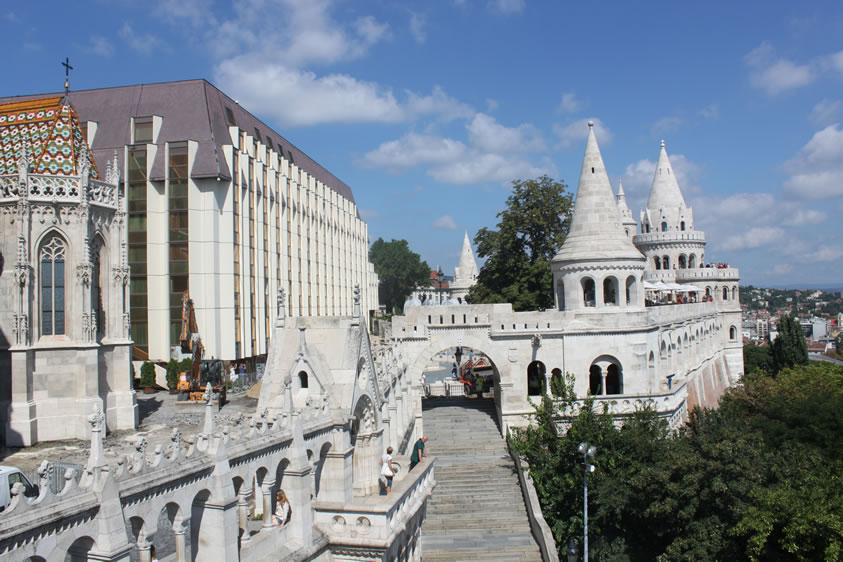 漁人堡 漁人堡(Halászbástya)是一個新哥特式和新羅曼風(fēng)格的觀景臺,位于匈牙利首都布達佩斯布達一側(cè)多瑙河河畔的城堡山,鄰近馬加什教堂。它修建于1895年到1902年之間,設(shè)計師是弗里杰·舒勒克(Frigyes Schulek)。第二次世界大戰(zhàn)期間,漁人堡近乎毀滅。1947年至1948年之間,弗里杰·舒勒克的兒子亞諾什·舒勒克負(fù)責(zé)了修復(fù)工程。 如今,城堡的一部分作為餐廳使用;乩壤镉薪^佳的觀景角度,而瑪加什教堂與漁人城堡間的銅像,則是第一位匈牙利國圣·伊斯特萬一世,圣·史迪分國王雕像(King St. Stephen’s statue)圣·史迪分國王是匈牙利第一個天主教國王(公元1000年加冕),同時也可以說是匈牙利國的建立者。漁人堡旁的希爾頓旅館,外層是茶色的帷幕玻璃映照著漁人堡和一旁的教堂倒影,美麗而迷人。 從塔和觀景臺,可以看到多瑙河、瑪格麗特島、東面的佩斯,以及蓋勒特丘陵(Gellért Hill)的全景。