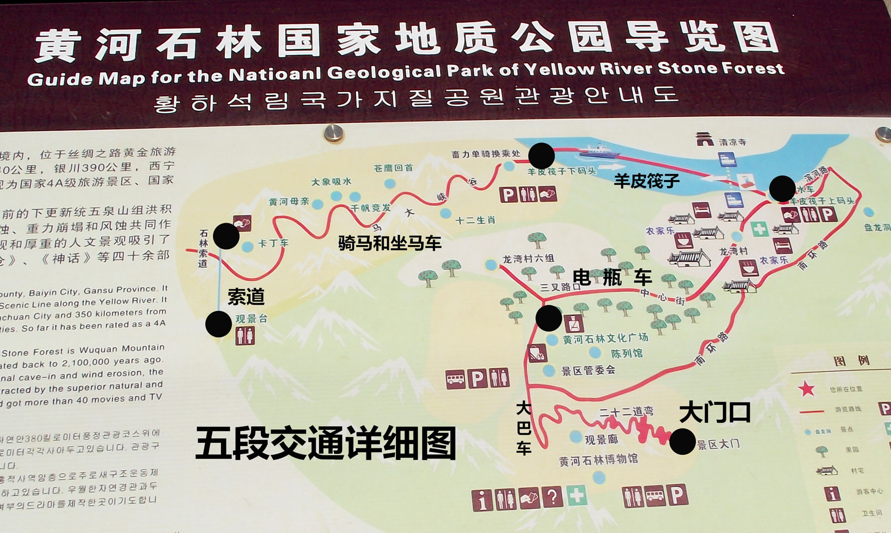 園內(nèi)包括飲馬溝(含老龍溝、豹子溝)、蟠龍洞——觀音崖、地灣三個(gè)主要景區(qū)。是一座集地貌地質(zhì)、地質(zhì)構(gòu)造、自然景觀和人文歷史于一體的綜合型地質(zhì)公園,它巧妙的將古石林群、黃河、沙漠、綠洲、戈壁、農(nóng)莊結(jié)合在一起,完美的呈現(xiàn)了一派世外桃源的景觀。景區(qū)核心景觀——古石林群形成于210萬(wàn)年前的積砂礫巖層,由于新構(gòu)造運(yùn)動(dòng),雨洪侵蝕及重力崩塌,形成許多高80-200米的峭壁、巖柱組成的峰林和峰叢。十里長(zhǎng)峽,如同畫(huà)廊。奇峰絕壁,崖壑裂隙,千姿百態(tài),神妙無(wú)窮。或亭亭玉立,婀娜秀麗;或粗獷古樸,壯觀恢宏。 景區(qū)集中展現(xiàn)了純天然、大構(gòu)造、多層次的地質(zhì)構(gòu)造,浸透著雄、奇、險(xiǎn)、古、野、幽的原始風(fēng)韻,充分體現(xiàn)了粗獷、雄渾、樸拙、厚重的西部特色,令人嘆為觀止,留連忘返。