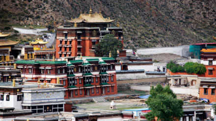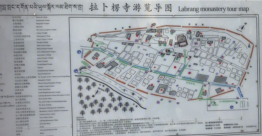 寺院坐北向南,占地總面積86.6萬平方米,建筑面積40余萬平方米,主要殿宇90多座,包括六大學(xué)院、16處佛殿、18處昂欠(大活佛宮。⑸峒爸v經(jīng)壇、法苑、印經(jīng)院、佛塔等,形成了一組具有藏族特色的宏偉建筑群,房屋不下萬間。