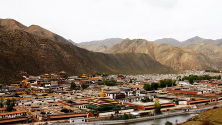拉卜楞寺,位于甘南藏族自治州夏河縣城西0.5公里處。本名噶丹夏珠卜達(dá)吉益蘇奇貝瑯,簡(jiǎn)稱扎西奇寺,是我國藏傳佛教(即喇嘛教)格魯派(黃教)六大寺院之一,一般稱拉卜楞寺。第一世嘉木樣阿旺宋哲大師創(chuàng)建于清康熙四十八年(1709)?滴跷迨辏1714)建立“拉章”(即嘉木樣佛宮),“拉章”音變?yōu)椤袄防恪,意為寺院最高活佛府邸?/p>