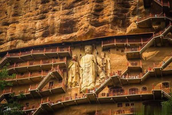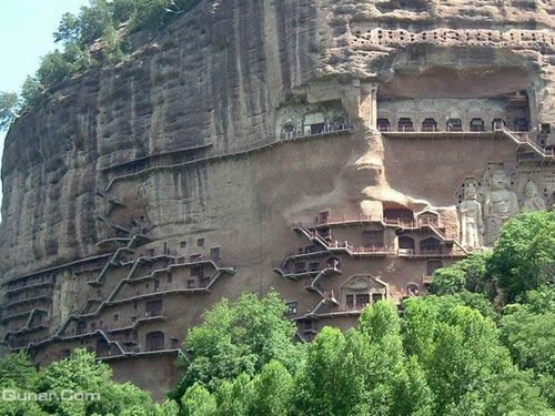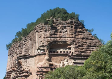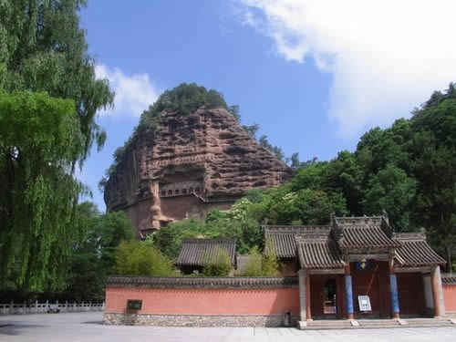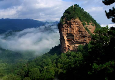麥積山石窟坐落于西秦嶺東段,小隴山林區(qū)崇山峻嶺中,因山崖一峰突兀挺立,拔地而起,猶如農(nóng)家麥垛,故名麥積山。山高142m,頂端有隋代舍利磚塔,古老孑遺植物白皮松遍布塔周;懸崖絕壁上雕鑿著1600余年來的209個(gè)洞窟7866身泥塑石雕及1300多平米壁畫,為此麥積山石窟為中國(guó)四大石窟之一,有東方雕塑陳列館之稱。摩崖造像、凌空棧道與蒼松翠竹、赤壁丹崖相互映襯,有麥積煙雨等神奇景觀。