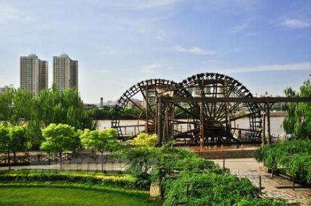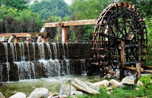 水車歷史悠久,外形奇特,起源于明朝,是蘭州市古代黃河沿岸最古老的提灌工具。蘭州水車,又叫“天車”、“翻車”、“灌車”、“老虎車”,園內(nèi)由雙輪水車、圍堰、水磨坊服務(wù)室和游樂區(qū)組成,立于黃河南岸,旺水季利用自然水流助推轉(zhuǎn)動;枯水季則以圍堰分流聚水,通過堰間小渠,河水自流助推。當水流自然沖動車輪葉板時,推動水車轉(zhuǎn)動,水斗便舀滿河水,等轉(zhuǎn)至頂空后再傾入木槽,源源不斷,流入園地,以利灌溉。水車園再現(xiàn)了水車這種古老的水利機械,可以使中外游人一睹為快。