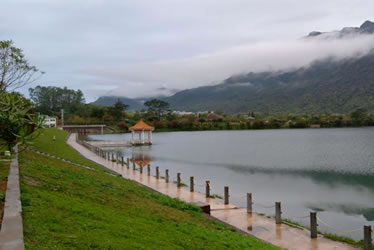 白水寨地處降雨頻密的增城北部山區(qū),充沛的降雨量不僅造就了中國內(nèi)陸第一高瀑的氣勢磅礴,也為白水寨帶來了美不勝收的湖泊風光。瀑布從428.5米的山上飛流直下,氣勢磅礴,蔚為壯觀。瀑布源頭蒼翠、險峻的群山環(huán)抱,仙姑天湖和七仙湖就像碧綠的翡翠般鑲嵌在層林疊翠間,這兩個大型的高山湖泊總容量達480萬立方米。在白水寨山下,瀑布流水又匯聚成一個天然的湖泊。湖水清澈,晶瑩如玉,晴朗之際,湖面宛若明鏡,將旁邊的青山密林、綠草紅花倒映其中,美不勝收。