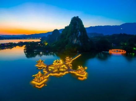 以不同的顏色交錯(cuò)投射到景物上,勾畫出七星巖景區(qū)內(nèi)神秘幽雅的堤岸、小橋,花木,巖山與湖水交相輝映,使夜幕下的七星巖更加絢麗多彩;同時(shí)開辟了星湖夜游項(xiàng)目,為廣大市民和游客在夜色中游湖觀光提供了一個(gè)美麗的環(huán)境 ,再造出“第二星湖”。增加了許多新的景點(diǎn),如牌坊文化廣場(chǎng),每當(dāng)夜幕降臨,霓虹閃耀,游人如鯽,當(dāng)露天音樂噴泉啟動(dòng)之時(shí),七星巖牌坊廣場(chǎng)更顯得壯觀,每逢周末或節(jié)假日,這里還可以欣賞一臺(tái)臺(tái)豐富多彩的文藝節(jié)目,真是令人如醉如癡。位于星巖東面的仙女湖,每當(dāng)太陽(yáng)西下,還可以觀賞到天然奇觀--臥佛吞日。
