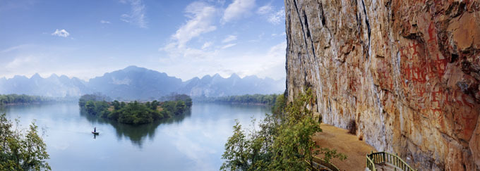 位于縣城西北25千米的明河畔,以其古老神奇的巖畫(huà)而聞名中外;ㄉ綆r畫(huà)是左江流域巖畫(huà)中的代表,也是世界同類(lèi)巖畫(huà)中單位面積最大、畫(huà)面最集中、內(nèi)容最豐富、保存最完好的一處巖畫(huà),被譽(yù)為是壯族文化的瑰寶。 1988年,花山巖畫(huà)被國(guó)務(wù)院列為全國(guó)重點(diǎn)文物保護(hù)單位。1998年,以花山巖畫(huà)為中心的花山風(fēng)景區(qū)被定為國(guó)家級(jí)風(fēng)景旅游名勝區(qū),成為與桂林漓江、桂平西山齊名的廣西三大國(guó)家級(jí)風(fēng)景旅游名勝區(qū)之一。2000年開(kāi)始,國(guó)家文物局實(shí)施花山巖畫(huà)保護(hù)計(jì)劃,對(duì)保護(hù)巖畫(huà)進(jìn)行深入研究。2003年6月,寧明縣啟動(dòng)花山巖畫(huà)申遺工作。2004年11月,國(guó)家建設(shè)部把寧明縣花山巖畫(huà)列入《中國(guó)申報(bào)世界遺產(chǎn)預(yù)備名單》。