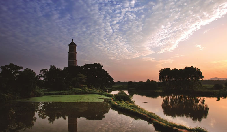 蓉峰塔位于縣城北,始建于清朝道光初年(1821年),塔高40余米,共五層,為八棱青磚結(jié)構(gòu)。遠(yuǎn)眺寶塔猶如文筆豎立,每當(dāng)夕陽(yáng)西下,塔尖猶如筆尖,塔影延及湖中,形同秀筆蘸墨。