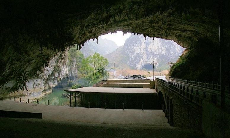 穿龍巖,位于縣城內(nèi)西北面,因其古時候為路人步行入城的必經(jīng)之道而又名鳳陽關。其西南面石壁高約180m,130m處有一小溶洞,被稱作鳳山的“鳳眼”,夕陽晚照,滿壁金光,為鳳山八景之一“丹崖晚照”。穿龍巖南面洞口寬約80m,高約30m,其中河床寬約20m。整個穿龍巖最寬約200m(含河床寬度),深度為400m,最高高度約100m,洞廳面積4.15萬平方米,排名中國第五。
