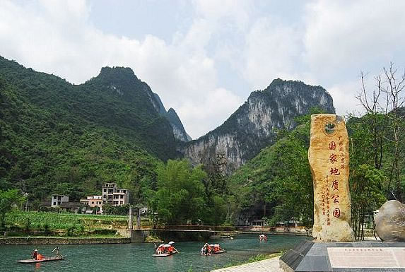 廣西樂業(yè)-鳳山世界地質(zhì)公園,位于廣西西北部云貴高原向廣西盆地過渡的斜坡地帶,由百色市樂業(yè)大石圍天坑群國家地質(zhì)公園和鳳山巖溶國家地質(zhì)公園組成,總面積930平方千米,F(xiàn)已發(fā)現(xiàn)大小天坑30個,是世界上最大的天坑群之一。地質(zhì)公園區(qū)中鳳山三門海景區(qū)擁有高穴馬王洞和水上天坑等地質(zhì)遺跡。天坑群中以大石圍天坑規(guī)模最大,深度和容積居世界第二;坑底森林面積10.5 萬平方米。