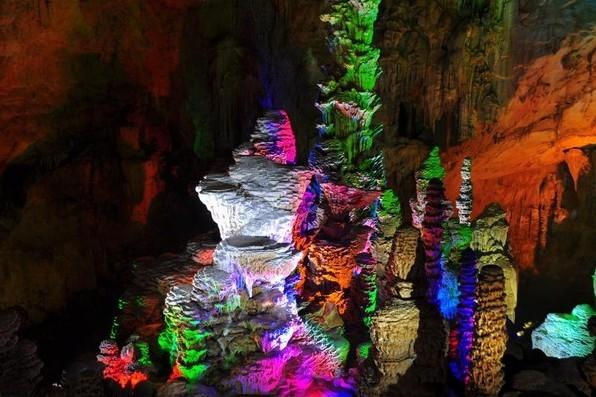 鴛鴦洞,位于縣城東面,鳳凰山腰,海拔700余米,為云貴高原南緣巖溶中高位雙層溶洞,洞中石柱、石筍、石幔琳瑯滿目。洞口高7.5m,寬12m。洞長480米,最寬處320米,巖廳最高點52米,面積為2.5萬平方米,洞內(nèi)大廳規(guī)模宏大。從洞口進入便是第一層洞,游程迂回全長1200米,洞中乳石崢嶸,石筍高達36.4m,象擎天巨柱直插天空,20m以上高度的石筍約15個,6m左右高度的石筍更是不計其數(shù),在多處聚集形成了奇特的洞中石林景觀。洞內(nèi)最大的石幔高約15m,寬6m,顏色潔白,酷似瀑布。