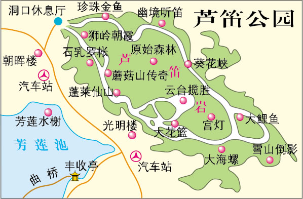 景區(qū)內(nèi)交通:一條路是沿著山南的芳蓮池畔往西走,可到洞口下方,再登上石級進洞。另一條路是從光明山東南麓緩緩向上走,穿過綠蔭小道,便到蘆笛巖洞口。