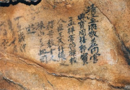 在蘆笛巖壁書中,保存比較完整、比較清晰是明代靖江王府采山隊的題名,是一件為人注重的文物。題筆寫道:“靖江王府敬差內(nèi)官典寶周禧、郭寶、孟祥帶領(lǐng)旗校人匠王茂祥、張文輝等數(shù)人十人采山至此,同游。丁丑歲仲夏月十有六日記!
