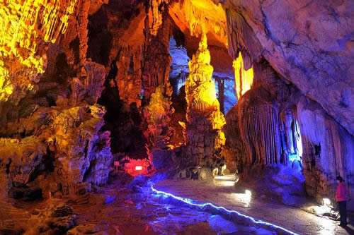 這些千姿百態(tài)的鐘乳石是由于地下水的作用,溶解了巖石中的碳酸鈣,再經(jīng)過上百萬年的沉淀堆積結(jié)晶而形成的,所有的景觀都是大自然鬼斧神工的杰作,沒有一點人工修飾,因此,蘆笛巖被譽為“大自然的藝術(shù)之宮”。
