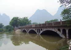進入蘆笛景區(qū)首先見到的就是一座端莊古樸的石橋—飛鸞橋。飛鸞橋又名飛龍橋,位于桃花江與蘆笛路相交處。臨桂縣志載,宋紹定年間(1228-1233)建有5孔石橋,稱飛龍橋。明清均重修。雍正6年(1728年)邕人于必勝等捐資修建,有碑記。1941年秋毀于戰(zhàn)火。1944年地方人士募得糙米400余擔(dān),重修成木板面橋。開發(fā)蘆笛巖后,于1964年改建成3孔石拱橋,1967年4月建成,同年5月驗收通車,當時稱“工農(nóng)橋”。