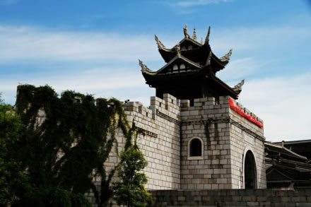 北城門又稱玄武門,為重檐歇山式頂木結構建筑,屋頂為青灰色瓦面,泥塑脊飾,是古代欽差下達皇帝圣旨的場所,初建于明朝天啟年(1621—1624年),清順治十七年(1600年)班麟貴之子應壽子承父職(土司)將土城墻改建為石城墻,清嘉慶三年(1789年),武舉人袁大鵬重修擴建,是青巖古鎮(zhèn)的象征之一。