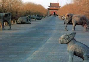 清世宗泰陵,居于清西陵陵區(qū)的中心位置,是清西陵中建筑最早、規(guī)模最大的一座。其余各陵分布在東西兩側(cè)。清泰陵是清西陵的首陵,埋葬著雍正帝及孝敬憲皇后、敦肅皇貴妃。位于永寧山主峰之下,始建于雍正八年(1730年)。 [18-19] 泰陵的神道,由三層巨磚鋪成,上南往北分布著40多項大大小小的建筑。第一座建筑物是進入陵區(qū)的一座聯(lián)拱式五孔橋,橋北有三座高大的石牌坊。這三座石坊,都是五間、六柱、十一樓形式,用青花石筑成,上刻有山、水、花、草、禽獸等圖形,被視為清西陵建筑藝術(shù)中具有代表性的作品。