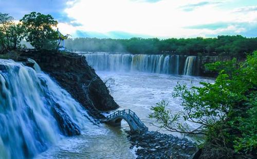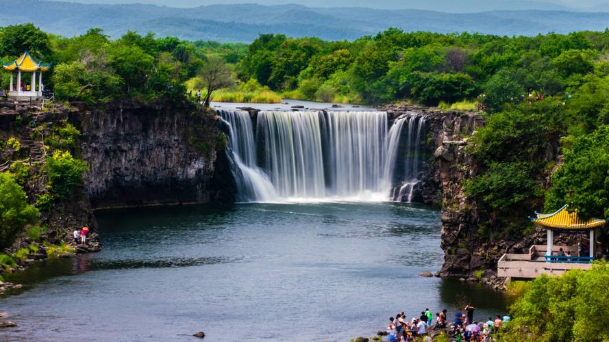 吊水樓瀑布位于鏡泊湖北頭。是景區(qū)的特級自然景源(世界級),酷似聞名世界的“尼亞加拉大瀑布”。平水期時,瀑布一般幅寬五六十米,落差十二米。但在汛期,最高落差僅十余米,瀑布最大幅寬可達(dá)四百余米,從南、西、北三個方向以排山倒海之勢從熔巖壁頂直撲黑龍?zhí)。似浮云堆雪,白霧四濺,百米之外,水珠鋪面;又似銀河倒掛,彩練懸崖,奔騰咆哮,聲如奔雷。與貴洲的黃果樹瀑布、黃河壺口瀑布、九寨溝諾日朗瀑布、臺灣的文龍瀑布、廬山的三疊泉瀑布并稱中國六大名瀑。