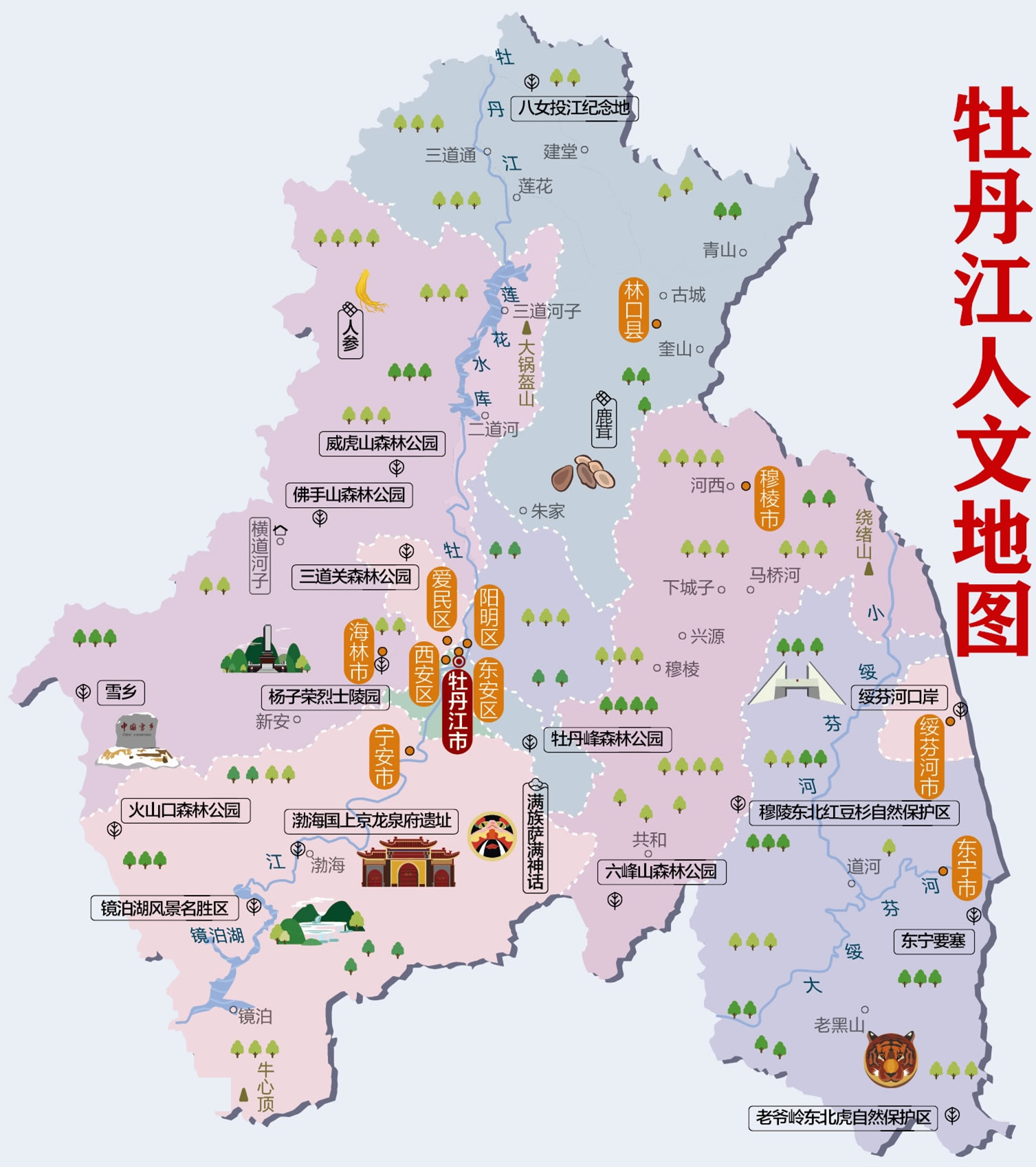 牡丹江市轄4個市轄區(qū)、1個縣,代管5個縣級市: