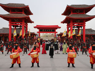 開(kāi)封府尹包拯奉旨領(lǐng)文武百官,設(shè)皇家儀仗,行開(kāi)園大典,迎四海賓客。擂鼓禮炮響徹云霄,張龍、趙虎、王朝、馬漢環(huán)伺左右,包大人口宣圣諭,恭迎嘉客入園,共享人間歡樂(lè)!每到旅游旺季,清明上河園迎賓門(mén)的廣場(chǎng)上摩肩接踵,好不熱鬧。