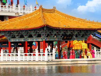 清明上河園中的這座水心榭,四面臨水,一橋相連,顯得通透空靈;榭頂玲瓏,梁柱纖秀,清麗雅致仿若出水芙蓉。隔水聆聽(tīng)由水榭傳來(lái)的管弦之樂(lè),絲樂(lè)緲緲,簡(jiǎn)直是神仙洞府也難以比擬的人間樂(lè)趣。