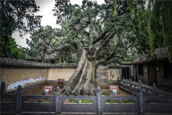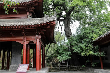 二程手植槐,樹高19.5米,圍粗4米。雖然樹干嶙峋,中空外實(shí),槐冠卻叢撥陰濃,新枝簇簇,樹姿優(yōu)美,老而不衰。相傳為北宋理學(xué)名家程顥到嵩陽書院講學(xué)時(shí)親手所栽。