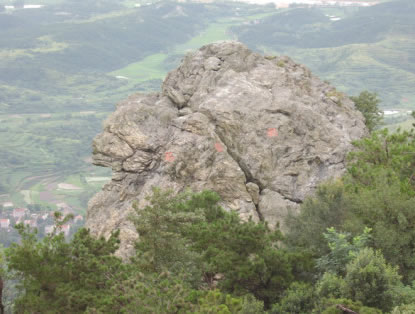 棋盤石:位于木蘭山山脊,在木蘭山風(fēng)景區(qū)售票處北偏西413米處,是一處已因構(gòu)成作用而松動的巨大變基火山巖(綠片巖)巖塊,石頭有一條寬約0.8米的拉張裂縫,險竣異常。棋盤石形成的地質(zhì)年代為距今7.5--8億年的新元古代,那條裂縫的形成,則是與新構(gòu)造活動有關(guān)。