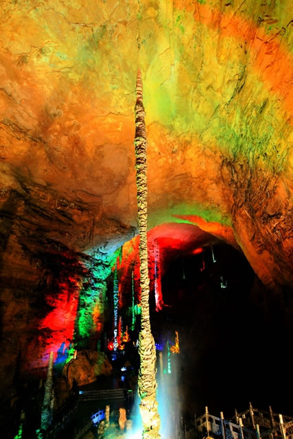 雪松是龍宮的第三大奇觀,也是黃龍洞內(nèi)生長速度最快的一根石筍,它通體雪白,高達(dá)17米,巍然聳立在龍宮大廳西端的斜坡上,“大雪壓青松,青松挺且直”就是它的真實(shí)寫照!把┧伞钡目茖W(xué)名稱叫棕櫚狀石筍,是洞頂?shù)嗡捌洚a(chǎn)生的飛濺水共同作用的結(jié)果,一般只有在空間較為高大的廳堂才能看到。根據(jù)其根部的棕櫚片取樣分析,“雪松”挺立在這里已經(jīng)有9.6萬年的時(shí)間了,因此也叫它“萬歲松”。