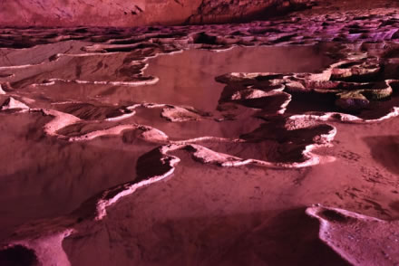 千丘田科學(xué)名稱為“流石壩”,也叫“酸田”, 它是水平流動(dòng)的水在洞底流動(dòng)過程中形成的碳酸鈣沉積。黃龍洞內(nèi)大大小小的千丘田不計(jì)其數(shù),縱橫阡陌,形似一片片頗為壯觀的田園風(fēng)光。
