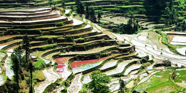 紫鵲界梯田位于新化縣西部山區(qū)水車鎮(zhèn)境內(nèi),她周邊的梯田達(dá)8萬余畝以上,其地勢之高,規(guī)模之大,形態(tài)之美,堪稱世界之最。紫鵲界生態(tài)環(huán)境優(yōu)美,梯田密集,形態(tài)原始,阡陌縱橫,線條流暢,山高水長,板屋交錯(cuò),充分展示出梯田的自然美、古樸美、形體美、文化美。尤其是隨著四季氣候的變化,使紫鵲界梯田更加婀娜多姿,如臨人間仙境。水奉公路盤旋于這些梯田之間達(dá)十余公里,梯田遍布于海拔500米至1000余米的十幾個(gè)山頭上,最大的不過1畝,最小的只能插幾十蔸禾,連綿起伏,輾轉(zhuǎn)盤旋,可謂是儀態(tài)萬方,令人贊嘆不已。據(jù)調(diào)查,紫鵲界梯田成型已有2000余年歷史,是苗、瑤、侗、漢等多民族