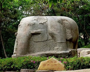 從龍洞西行,在林木掩映的山坡上.屹立著一座碩大的漢代圓雕石象。石象依一塊花崗巖巨石的自然形狀雕刻而成雕刻而成,象身高2.6米,長(zhǎng)4.8米,背寬3.5米,石像耳闊體肥,四肢健壯,長(zhǎng)鼻巨牙、卷尾粗足,形態(tài)雄奇,豐滿(mǎn)肥碩。象身西側(cè)有一高0.88米,寬0.49米,深0.2厘米的陰鑿凹面,系未見(jiàn)刻銘的題榜,象身東側(cè)以陰線(xiàn)刻一高1.13米,寬0.62米的方框,內(nèi)刻隸書(shū)“象石”字樣,在刻銘與象前腿之間,還鑿刻了一個(gè)頭梳“丁”字形發(fā)髻,手持勾鞭,腳帶鐐銬高0.92米的馴象奴。象的四足均踏著蓮花,體現(xiàn)了佛教中六牙白象王在水中步步蓮花的故事傳說(shuō)。它是孔望山漢代佛教造像有機(jī)整體中不可分割的一部分。此石系目前我國(guó)發(fā)現(xiàn)的東漢時(shí)期最大的圓雕石刻,石象南側(cè)約一百五十米處,還有與此同時(shí)期的石雕鎮(zhèn)海蛙,此蛙為當(dāng)時(shí)鎮(zhèn)海之物。體長(zhǎng)240厘米,寬220厘米,通高110厘米,石蛙頭部略損,前兩肢半殘,眼睛陰刻,背上遍刻陰線(xiàn)鱗紋。這兩座石雕,別特是石象,氣勢(shì)雄偉,造型精美。均為我國(guó)珍貴的石刻藝術(shù)珍品。