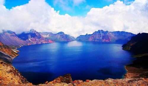 天池位于長(zhǎng)白山十六峰的環(huán)抱簇?fù)碇,背倚海?749米的長(zhǎng)白主峰白頭峰,南北長(zhǎng)約4400米,東西寬約3370米,其池水的海拔高度為2189.1米,比新疆的天山天池還要高出200余米,是中國(guó)最高、最深的火山湖。