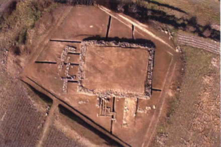 房西偏房位于正房西側(cè).南北長7.7米、東西寬3.9—5.3米,呈南寬北窄,殘高0.4米。位于正房西端,與正房臺基相連。門道位于偏房兩側(cè)中間處,南北寬1.8米、東兩進深0.75米、高0.09米,其建筑方法基本同于正房。