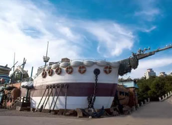 海盜村以海盜和海盜景物的卡通造型,對(duì)所有建筑,游樂設(shè)施、休閑場所,景觀進(jìn)行包裝。一期工程中的海盜船,是國內(nèi)僅有的架設(shè)在海灣海平面上的海盜船。它的支點(diǎn)高13.5米,最大擺角120度,每船可以乘游客40人。