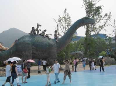 侏羅紀(jì)激流探險(xiǎn),總占地面積8600平方米,以一種時(shí)空穿插的景觀設(shè)計(jì)手法,將五種八只侏羅紀(jì)時(shí)期的恐龍置身于虛幻的遠(yuǎn)古村落中。載客古船,沿210米長,15米高的水道激流急下,沿途中,一只高9米,長19.8米,重約8噸的亞洲最大的機(jī)械恐龍“巨無霸”,不時(shí)的向沖刺在激流中的游人搖頭擺尾,吼叫或噴水,載客古船激起的25米高的巨浪。