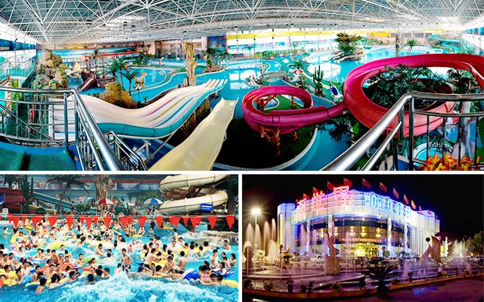 石家莊天山海世界是國(guó)內(nèi)較大的室內(nèi)恒溫水上戲水項(xiàng)目,是按國(guó)家AAAAA級(jí)標(biāo)準(zhǔn)全力打造的全民健身樂(lè)園,坐落在河北省石家莊高新技術(shù)開(kāi)發(fā)區(qū)。建筑面積約5萬(wàn)平方米,總投資達(dá)10億人民幣,室內(nèi)凈高30多米。占地130余畝。該項(xiàng)目以“水”為主體,處處體現(xiàn)了水的存在。萬(wàn)余平方米的戲水大廳,分兒童戲水區(qū)、成人戲 水區(qū)、按摩區(qū)、造浪區(qū)及漂流河。為了滿足冬泳的需要,戲水大廳設(shè)置了恒溫設(shè)備,保持了室溫30℃,水溫28℃;為了解決水質(zhì)問(wèn)題采用了24小時(shí)不間斷循環(huán)水消毒,使水的純凈度達(dá)到國(guó)際標(biāo)準(zhǔn);另外特設(shè)了一次能容納200余人的快餐廳,以及桑拿、保健、按摩等設(shè)備設(shè)施。