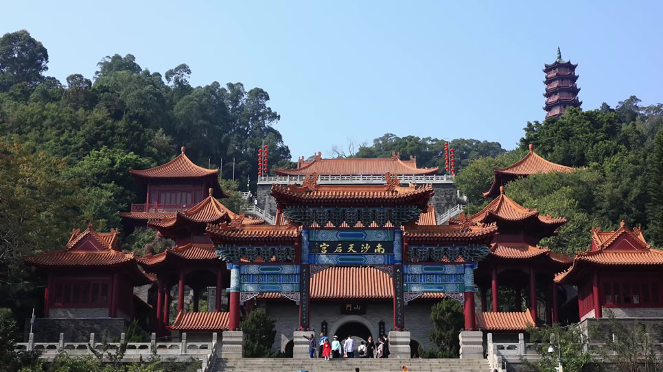 廣州南沙天后宮,又叫“媽祖廟”,位于廣東省廣州市南沙區(qū)天后路88號,坐落于大角山東南麓,地處粵港澳大灣區(qū)之心,瀕臨珠江出?诘牧尕暄,占地面積達18萬平方米。廣州南沙天后宮前身是明代建于鹿頸村的天妃古廟,清乾隆年間經(jīng)重修定名為元君古廟,抗戰(zhàn)時期被日寇飛機炸毀,而后于1994年重建。廣州南沙天后宮是為紀(jì)念海上女神林默而建,是一個以媽祖文化為主題的景區(qū),是粵港澳大灣區(qū)媽祖文化交流中心,亦是東南亞最大之媽祖廟。廣州南沙天后宮采用清式建筑對稱布局,高低錯落地依山而建,建筑的特點集北京故宮的風(fēng)格和南京中山陵的氣勢于一體,規(guī)模為現(xiàn)今世界同類建筑之最。廣州南沙天后宮由廣場、宮殿和南嶺塔三部分構(gòu)成,“天后八景”包括:濱海銀灘朝陽、五彩靈徑、媽祖靈釵、“南沙人”遺址、靈宮賜福、南嶺夕照、抗戰(zhàn)神炮、默娘之家八個景點。